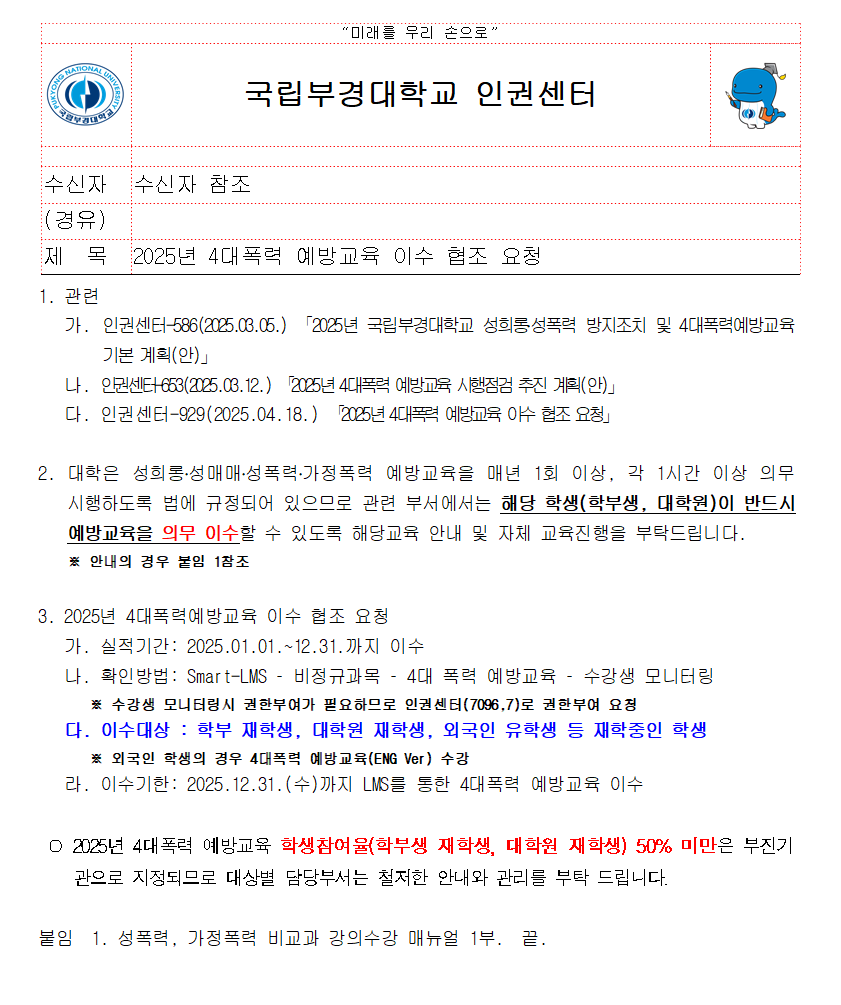 2025년 4대폭력 예방교육 이수 협조 요청